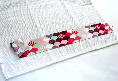 - Place a center accent strip, right side facing up, on top of a towel. Line up the bottom edge of the accent strip with the drawn horizontal line. The folded outside edges of your accent strip should be flush with the hemmed sides of the towel. If they aren’t perfect, re-press the folds as needed to make an exact match.