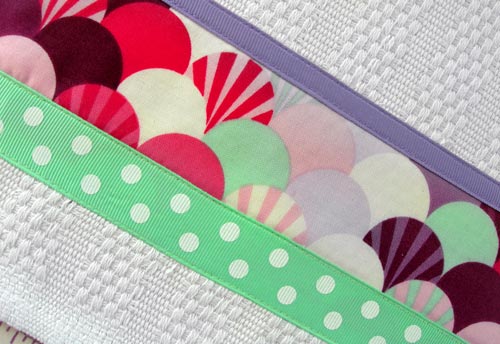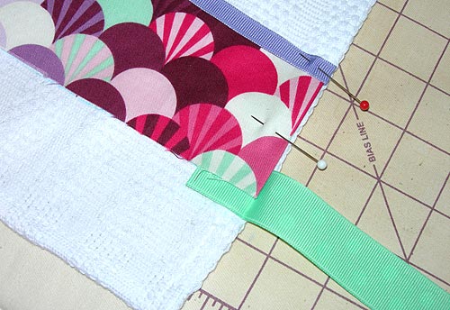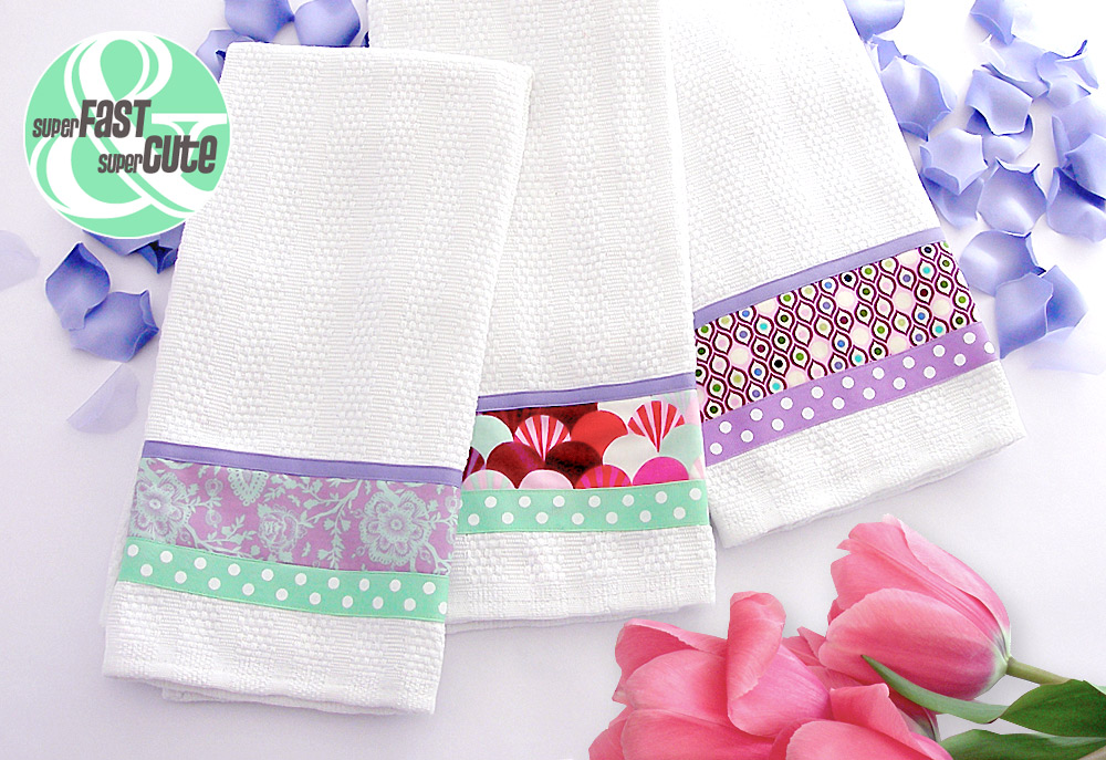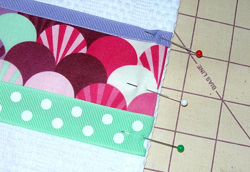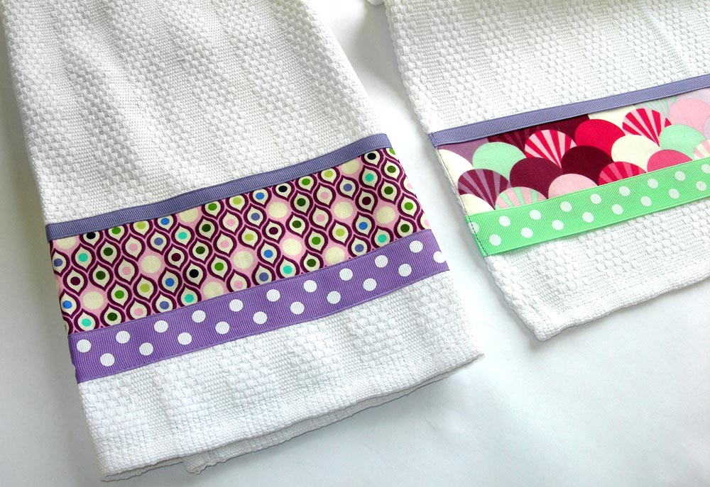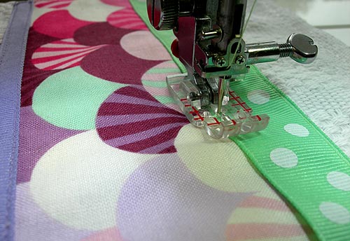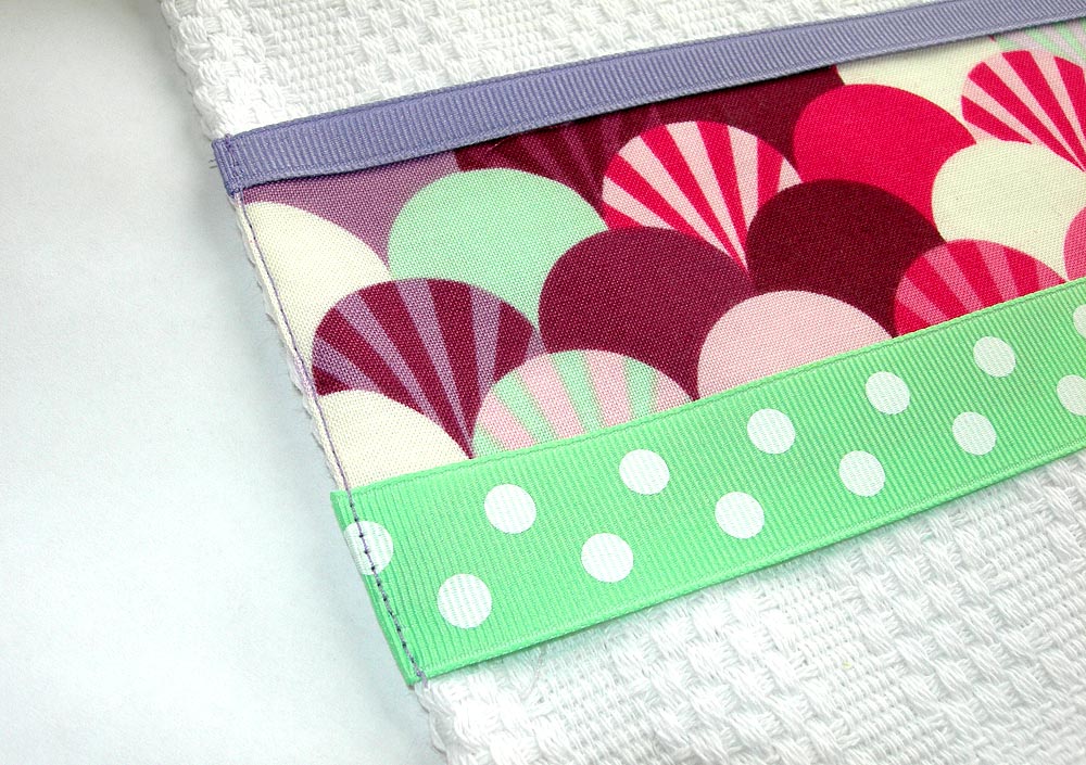 NOTE: If you are using two colors of ribbon, as we did with two of our three towels, this will mean you will have a visible seam against one of the ribbons. It’s okay… keep breathing. This seam is at the very back of the towel. Mine worked out nicely because, as I always say, my Janome machines stitch very precisely even right on the edge of the fabric. Love that!