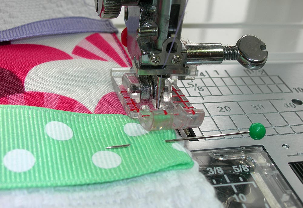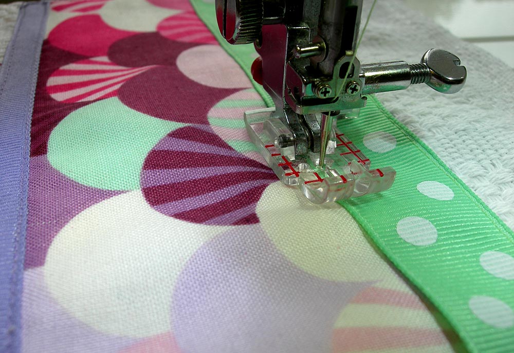 - Carefully edgestitch along both sides of each ribbon. I used my optional Janome Clear View Quilting Foot, which has a variety of awesome bright red guide lines to help keep even the tiniest of seams straight.
