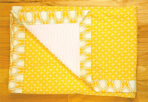 Although we used a classic white, chenille comes in a variety of fun colors that can be paired with pretty cotton prints for the front of the blanket and the binding. We suggest a smaller, repetitive print for the main blanket with a bolder coordinating motif for the binding.