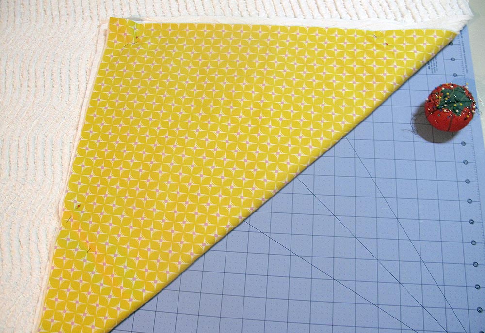 - At each corner, stop, remove the project from your machine, fold a pleat in the corner to make a 45˚ angle, turn the corner, and start stitching again.