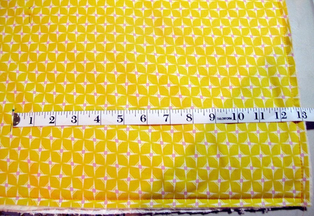 - Measure 13″ from the top of the play mat and mark with a pin or make a small dot with a fabric pencil or pen. Do this multiple times across the quilt. Connect the pins or dots to create a guide line for your line of quilting all the way across the mat.