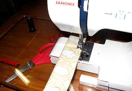 - Topstitch across both ends. This will close the opening left for turning on the one end, but you want to do both ends so they match. You’ll end up with a finished tie that is 41″ x 2″ – just right to wrap around the folded and rolled play mat and tie into a nice bow.