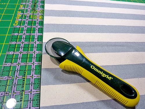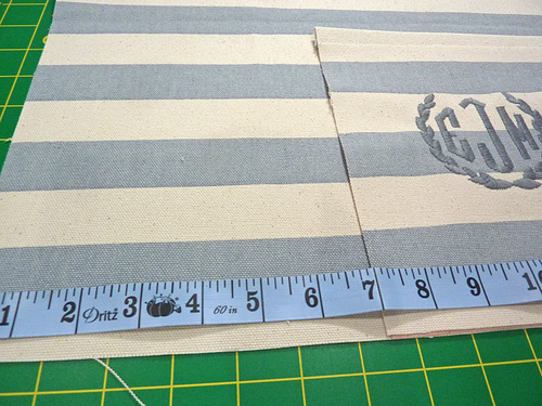 - Contrasting thread in all-purpose or rayon for the optional monogram; we used all-purpose thread in a gray slightly darker than our fabric’s stripe