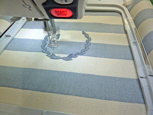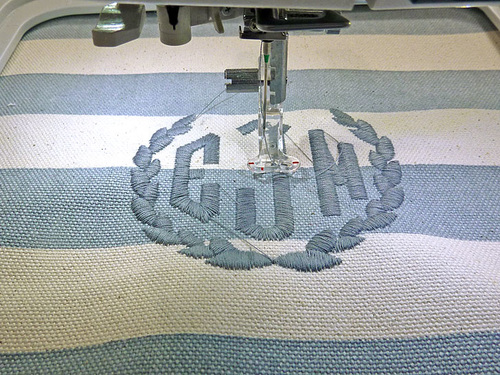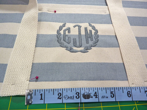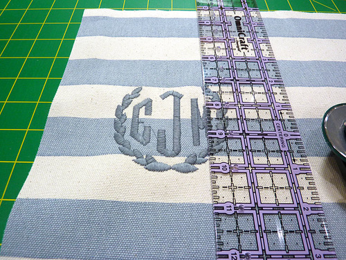 - When the embroidery is complete, trim the pocket panel down to 7” wide x 9” high, centering the monogram within the trimmed panel.