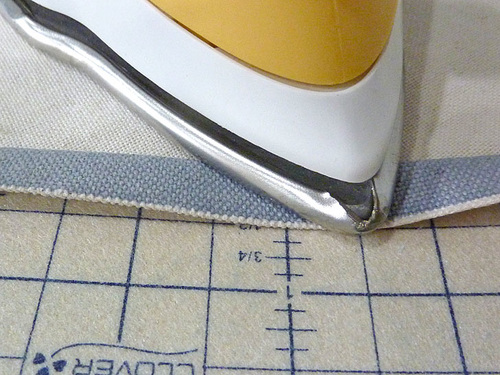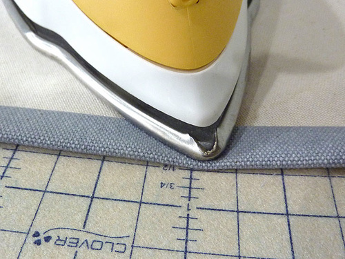 - Along the top raw edge the exterior pocket panel, create a simple ½” double fold hem. To do this, fold the raw edge back ½” and press.