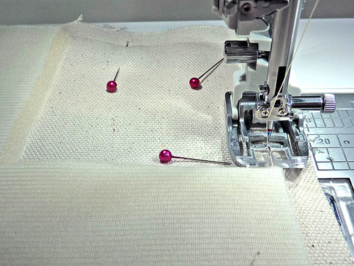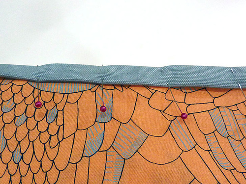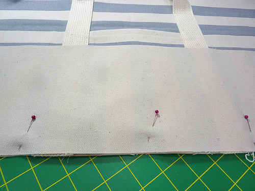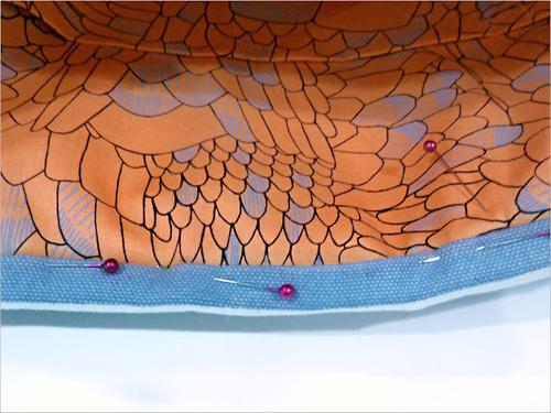 - Re-fold the top hem of the exterior so the folded down hem covers the top raw edge of the lining. Pin the hem in place all around.