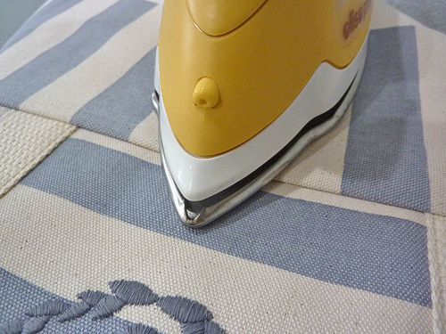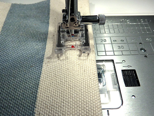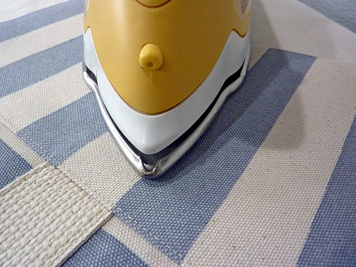- On each strap, edgestitch through all the layers from the left outer pin mark to the right outer pin mark. This creates a thinner, sturdier section as a carrying point for the handles. You’ve likely seen this technique on many commercial totes.