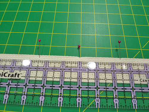 - Measure 2½” to the right of center and 2½” to the left of center. Place a pin at each of these points.