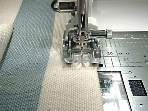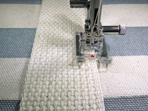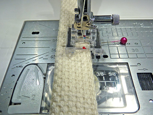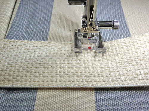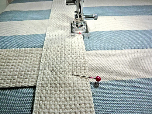 - Edgestitch along both sides of the webbing, stopping to crossover from one edge to the other at the 10½” mark.