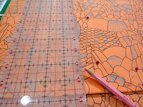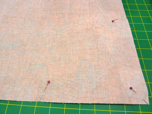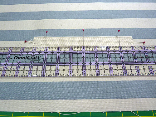 - Measure 7” in from each raw side edge and draw in a vertical pocket division line. Place a few pins horizontally across each line.