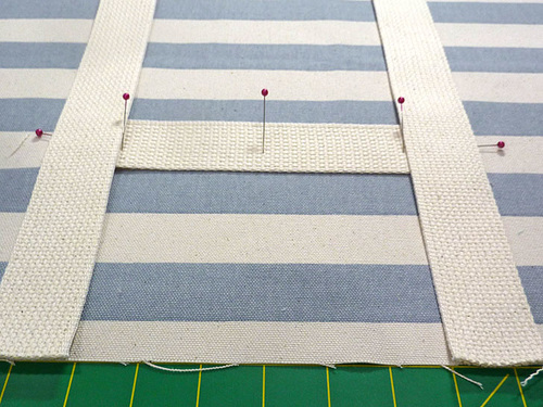 - Place the raw ends of the strap flush with the bottom raw edge of the fabric panel, spreading the straps so they are 6” apart and covering the raw ends of the horizontal luggage strap. Make sure the webbing creates a clean loop above the top raw edge of the fabric panel; you don’t want any twists or turns in the webbing. Pin the webbing in place along both sides from the bottom up approximately 10½” along each side. Again, we say “approximately” because we aligned our stop point with the bottom edge of one of the fabric motif stripes.