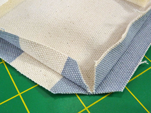 - Remember, the foam is cut away from the bottom corners, so when stitching across and pivoting at the bottom corners, you are stitching on just the main fabric panels.