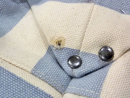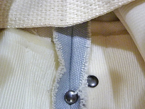 - On both the front and back panels there are two sets of two rivets at the upper portion of the strap. The topmost rivet sits just under the cross over stitching on the webbing (the 10½” marked point from above). The second rivet is 1½” below the first, which on our fabric meant it was nicely centered within a gray stripe.
