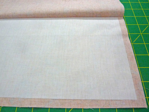 - Unfold wrong side up so the crease line in visible. Place the interfacing panel against one half of the pocket panel. One long side of the interfacing should be aligned with the center crease and there should be ½” of fabric showing beyond the interfacing along both sides and across the bottom. Following manufacturer’s instructions, fuse in place.