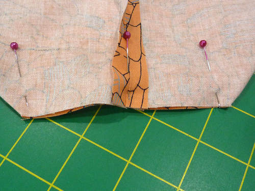 - Press open the seam allowances and align the side and bottom seams, flattening each corner into a little peak. Pin across the corner.