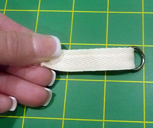 - Slip the twill tape through the D-ring, pulling it all the way through so the ends of the tape are flush with one another.
