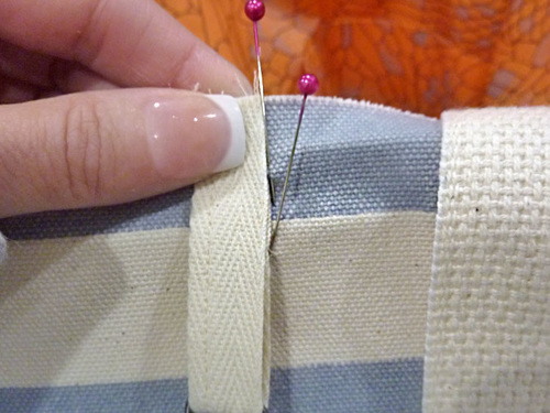 - The loop is positioned against the front exterior panel approximately 1” from the bag’s left strap. Unfold a small section of the top hem in order to align the raw ends of the twill tape with the raw edge of the unfolded hem. Pin together.