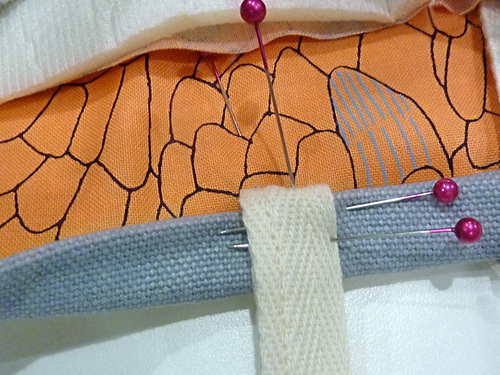 - Place the handle into position exactly as you did on the back panel, making sure the two sides are the same 6” apart. It is very important that the webbing lines up front to back. Pin the handle strap in place from the bottom raw edge up 10½” , again taking the time to make sure there are no twists in the loop.