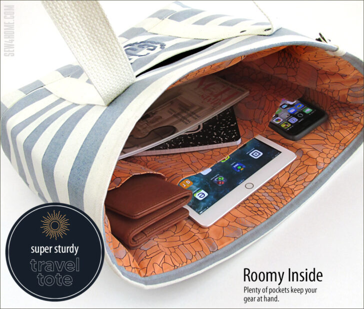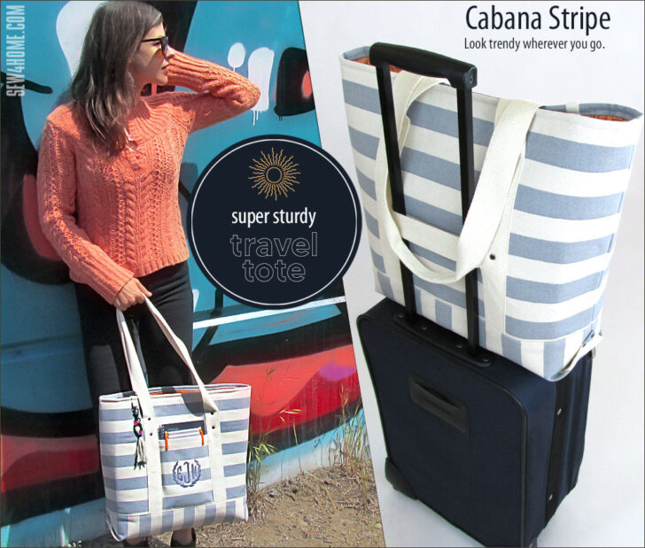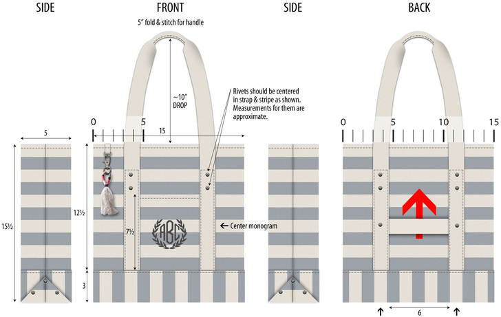Since we designed this tote for summer excursions, we added a handy horizontal strap at the back that can be slipped over the handle of a piece of rolling luggage. The width on our sample is 6”, which should work for most standard handles. That said, we do suggest measuring your bag to insure it is right for you; some handles flare out at the top, which could mean you need a slightly wider strap. This is an easy alteration to make; just remember you will need to adjust the position of the handle straps to match on both the back and front panels, and depending on the final width required, you might even need to enlarge the front pocket just a bit.