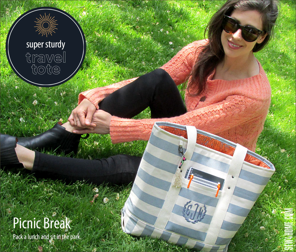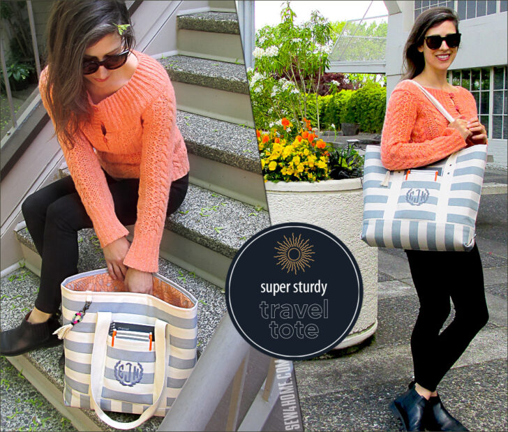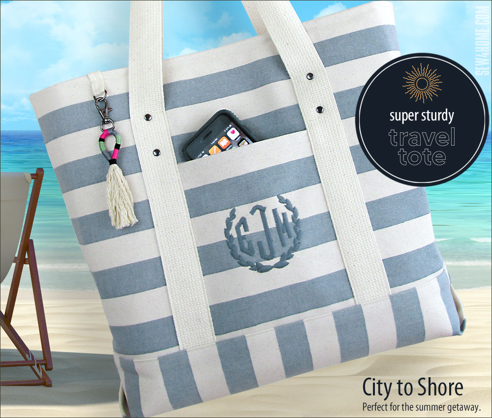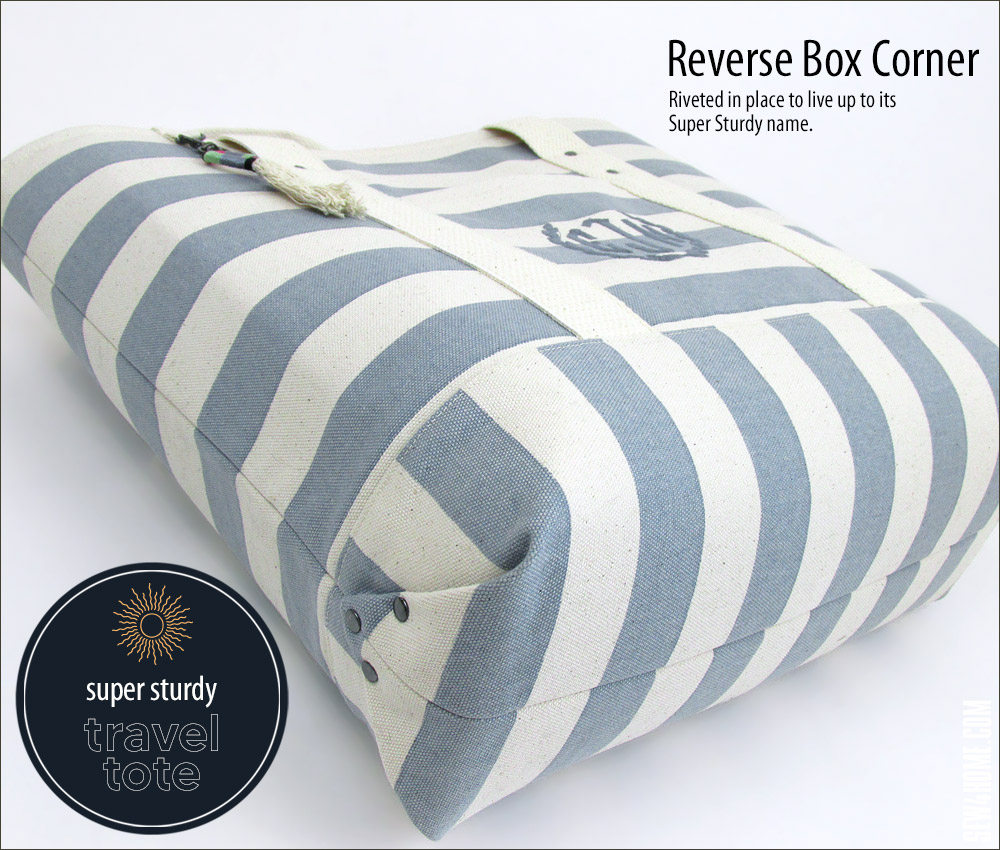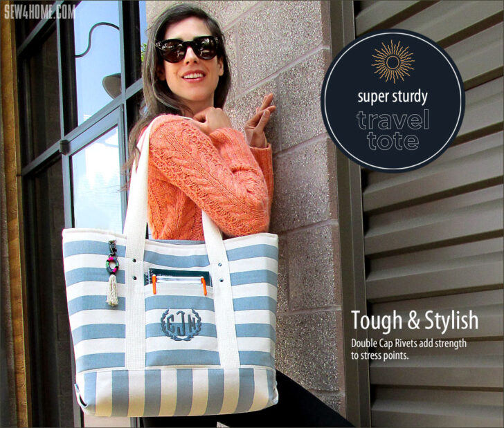 Summer is out-and-about time. Time for traveling near and far. Time for a tote that can stand up to all the adventures. Our Super Study Summer Tote is ready to roll. Double cap rivets add strength to the bag’s straps and other stress points. They are easy to work with and look great when installed. Our fabric choice for this project was a classic cabana stripe canvas, and we added a pretty monogram on the front pocket to both personalize as well as identify… an important feature when your belongings get piled with other’s during a day at the beach or park. Read on for all the step-by-step instructions, including the cool reverse box riveted corners.