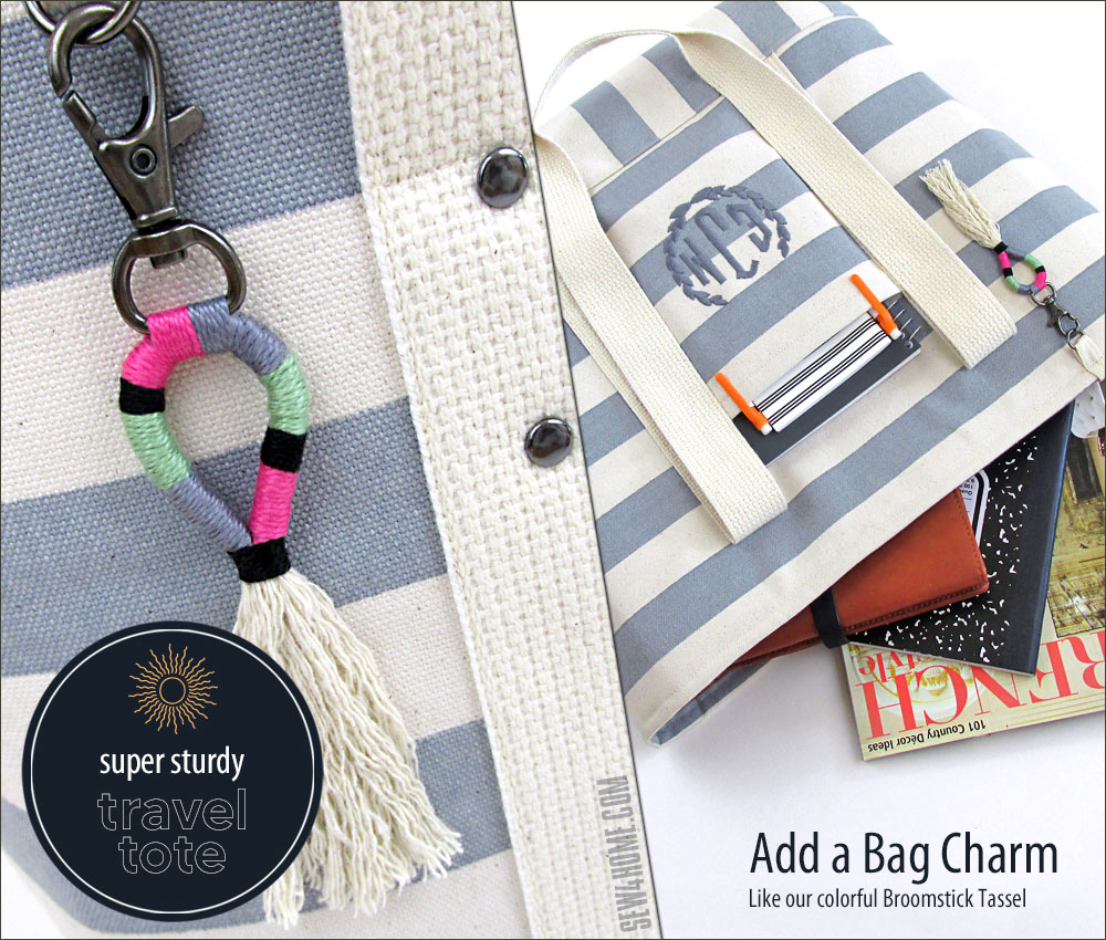 The finishing touch, which adds a cute accent splash, is the optional tassel along the top of the tote. We used a Swivel Hook and D-ring set, fashioning a pretty Broomstick Tassel onto the hook so it can be taken on and off. It would be a great clip to keep track of keys while you’re out and about…. or running into the waves to cool off.