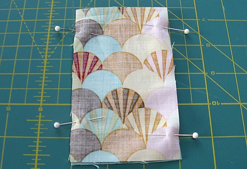 NOTE: If you are using a directional print, as we did, you need to remember which side is up. As you see in the photo above, start with your print fabric running the right way and your ribbon loop facing down. Drop the loop inside, keeping this same configuration (in our sample, the fans are running up and the ribbon is hanging down) and pin in place. Then, when you turn the sachet right side out, your loop pulls up to the top and your pattern is still going the right way. - Using a ¼” seam allowance stitch the horizontal top seam.