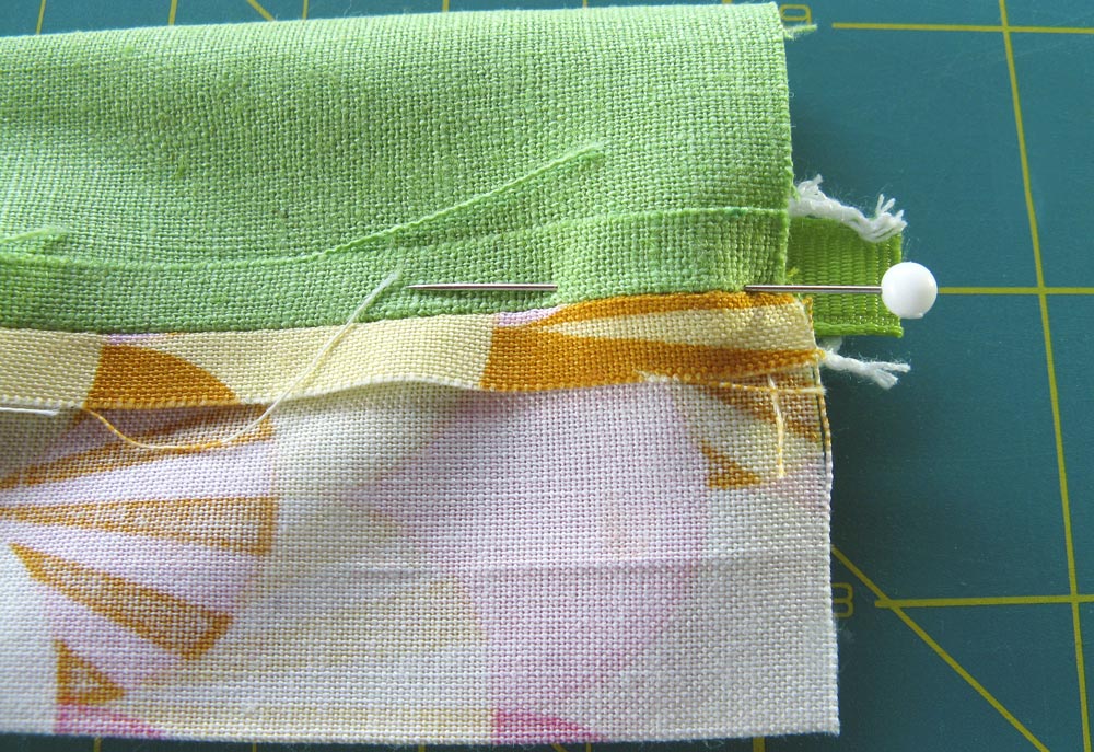 - Horizontally pin along the very edge of the salts so they don’t slide down into your stitching area. Your folded bottom edges should be flush.