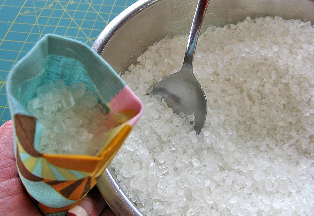 - Fill with bath salts. You want the sachet to be full, especially at the corners, but remember you need to be able to shift it all down far enough to allow you to edgestitch the bottom closed. We left about ½” – ¾” to work with.