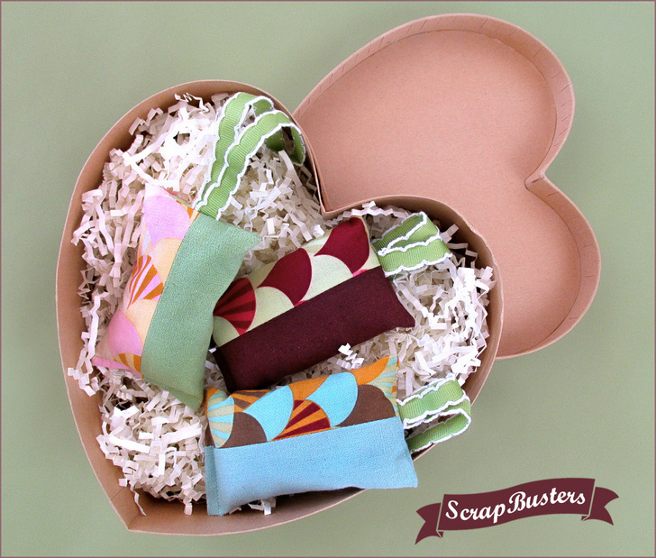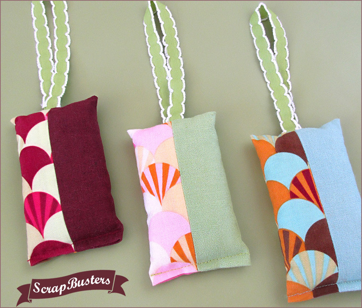 These sweet little sachets take such a tiny bit of fabric, you could easily make a basket of them from just a couple eighth yard cuts of fabric. Or, dip into your scrap stash for a few of your favorite little leftovers. Our samples are filled with epsom salts scented with essential oil. Fast, easy and economical all around. And, of course, they are also pretty as a picture… especially with a decorative ribbon hanger. Is that the sweet smell of gift-giving success?!
