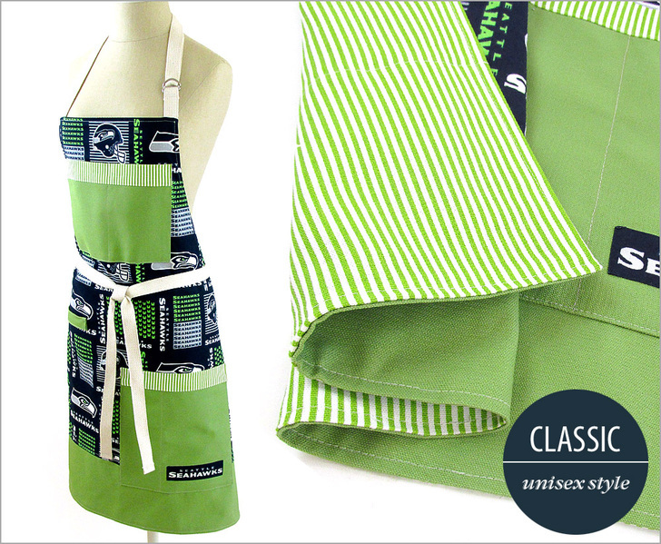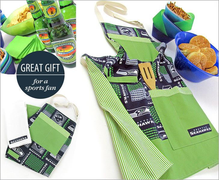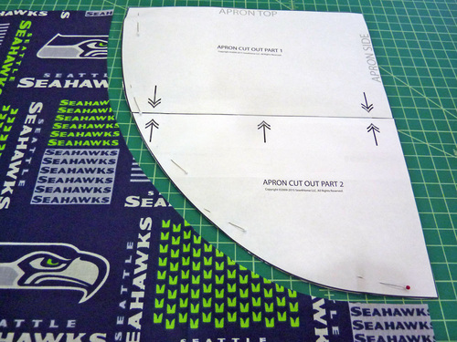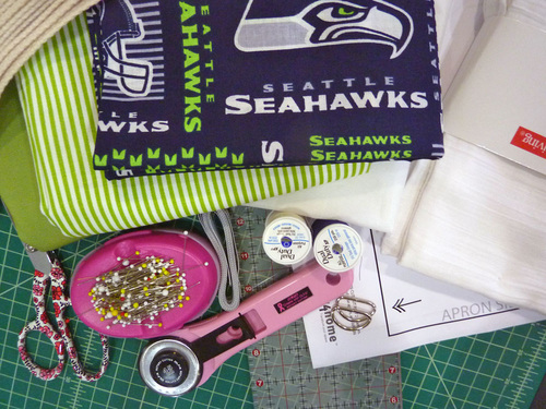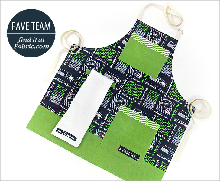 - 1 yard of 44″+ wide cotton broadcloth or similar in a sports team motif for the body of the apron; we originally used 58″ NFL Cotton Broadcloth in Seattle Seahawks