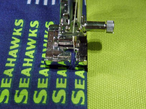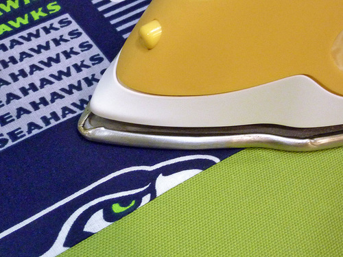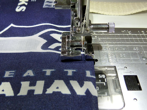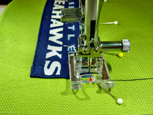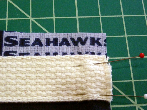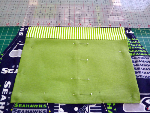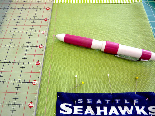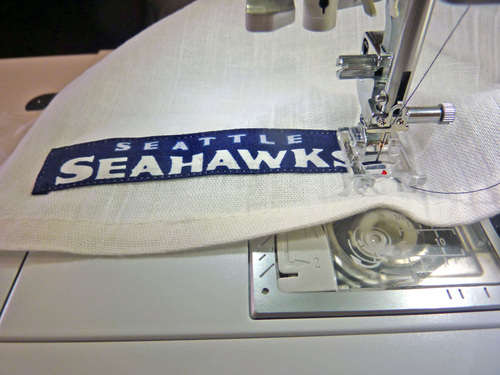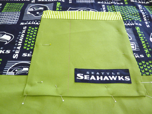 - On the lower larger pocket, pin the optional team logo in the bottom right corner. Position to best fit the size and shape of your logo. Our Seahawks logo was 1″ up from the bottom edge and 1″ in from the right side.