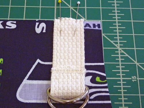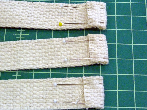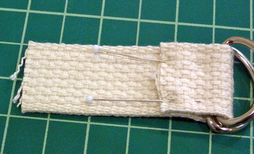 - Slip the 3½” length through both D-rings. Fold the webbing back on itself about 1″ and pin in place.