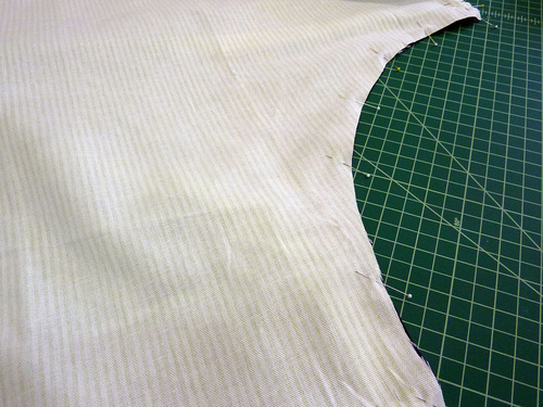 - Use the armhole pattern to cut the armhole curve from both upper corners of the panel. You’ll cut one side with the pattern facing right side up and the other side with the pattern facing right side down.