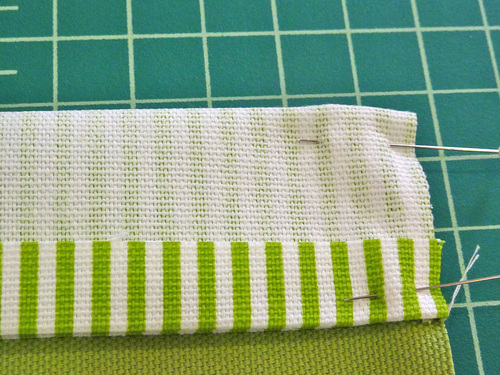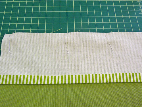 - Fold down the accent band, right sides together, until the pressed edge of the band just covers the horizontal seam. Pin along each side.