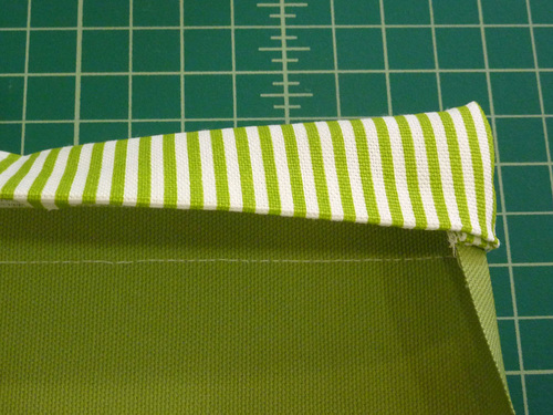 - Flip the accent band right side out. This will bring the pressed edge around to the back and the side edges of the main pocket panel will begin to fold in.