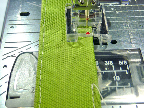 - With the machine still threaded with the topstitching color in the top and bobbin, edgestitch around all four sides of the strip