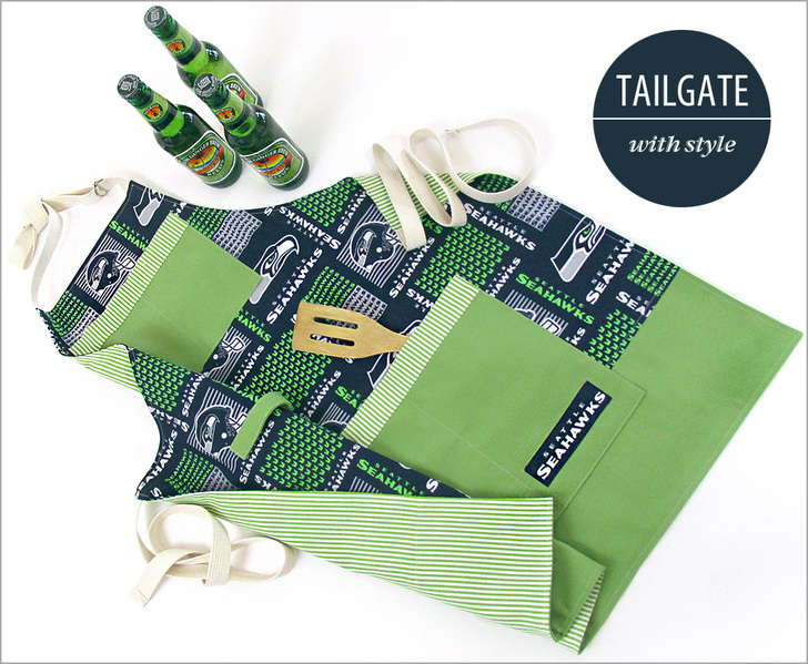 Show your team spirit with a fan-favorite tailgate apron in team logo fabric. Since Sew4Home is located in the Pacific Northwest, we chose Seattle Seahawks fabric for our sample apron, but there are lots of NFL® options. We’ve linked below to the current selection at Fabric.com. The logo fabric is augmented with both a solid and a stripe in coordinating team colors for the lining, pockets, and bottom accent band. Breaking up a busy print, like the team logo fabric, with more neutral tones and patterns adds interest and actually helps emphasize the feature fabric. Pick your favorite team and get ready for a tailgate, BBQ or picnic party!