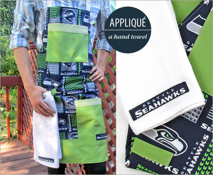 We fussy cut a logo from the team fabric and appliquéd it to a store-bought towel. The apron features a horizontal loop on one side to hold a towel, so you always have something handy to wipe up the BBQ sauce.