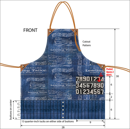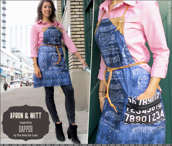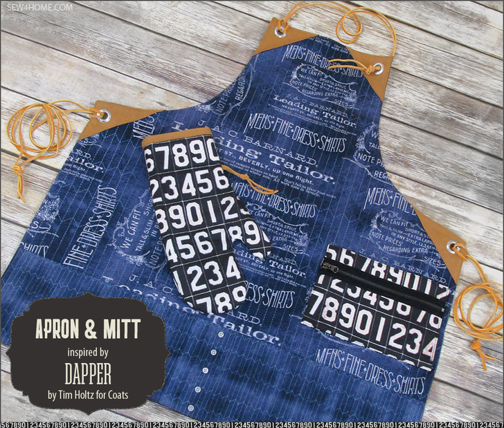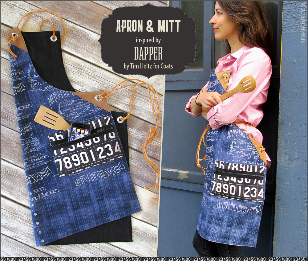 While working on this gorgeous apron, I admit to humming that old nursery rhyme under my breath, “Tinker, Tailor, Solider, Sailor….” We absolutely love the vintage tailoring motifs that run through the Dapper collection by Tim Holtz for FreeSpirit Fabrics. We took the theme and ran with it, designing an apron with subtle hints of bespoke couture. Along the bottom hem is a pleated accent panel that mimics the front of a tuxedo shirt – complete with five shirt buttons. Add to that, beautiful faux suede corner patches, echoing the elbow patches on an English Earl’s day jacket. A very cool double pocket graces the front, and leather lacing ties everything altogether. There’s even a matching oven mitt.