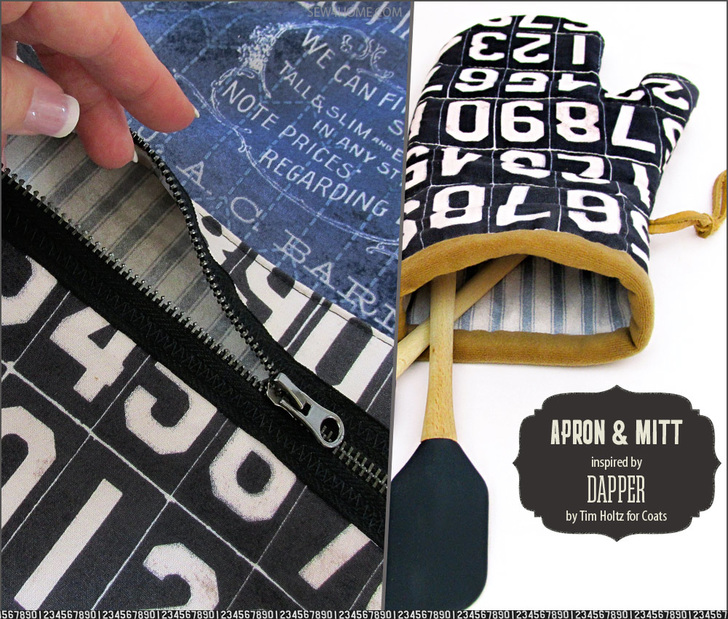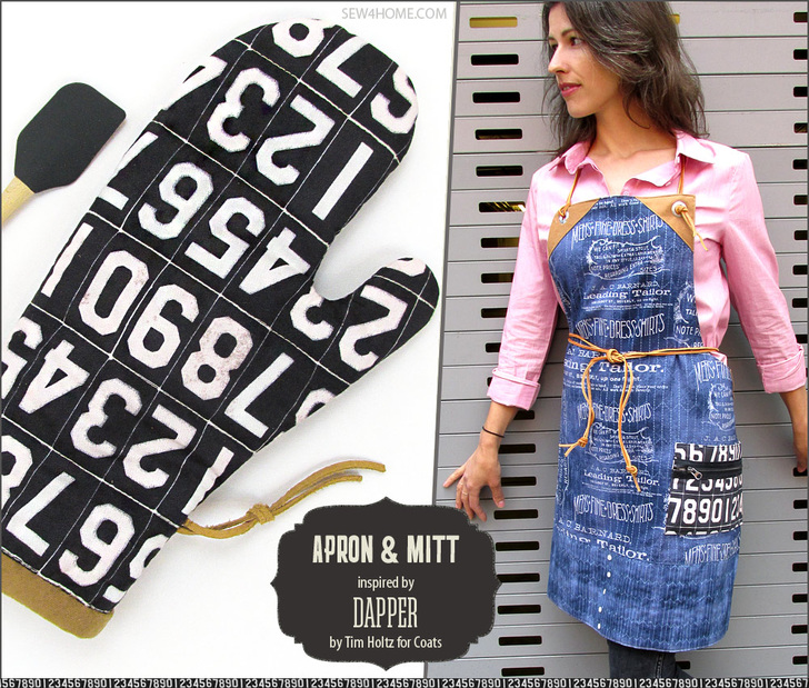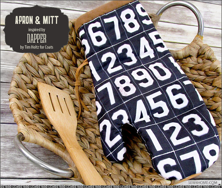 Once again, we’re all about the fussy cut! Tim Holtz always has such amazing motifs running throughout his collections. In the case of Dapper, we centered the vintage advertising clips from Tailored down the front of the apron. Then we worked with his Numbers motif to cleverly cut the pocket front and the exterior of the oven mitt. The dotted lines printed across the Numbers fabric became built-in guidelines for the mitt’s quilting.