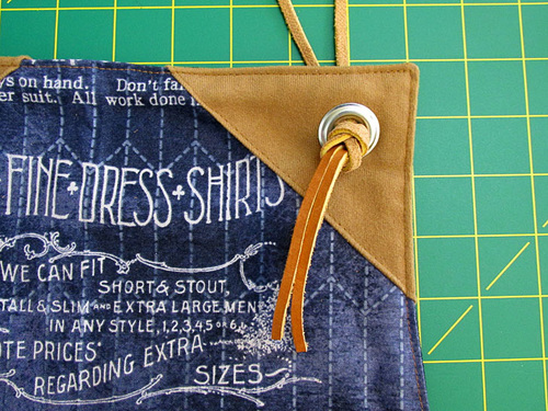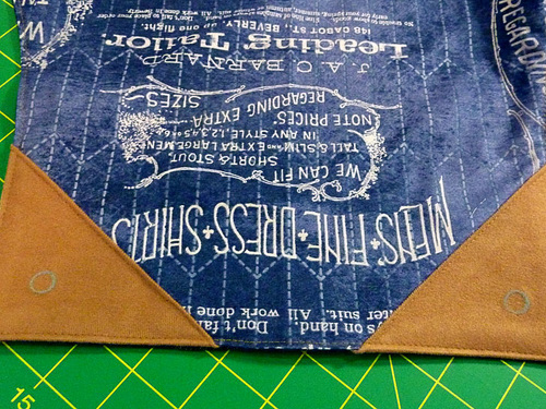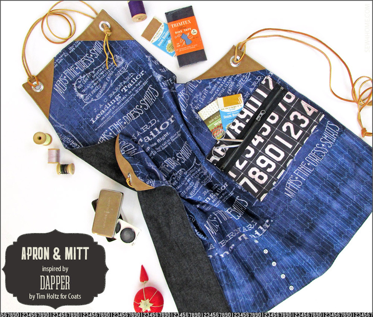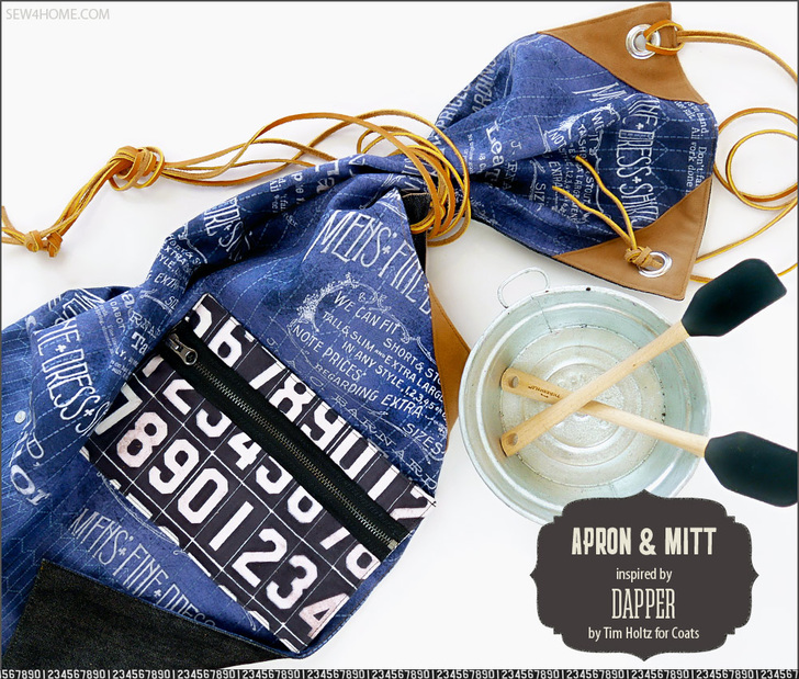 We combined the wonderful Dapper fabrics with a classic black denim for the apron’s lining. This collection blends beautifully with traditional substrates, like the denim, as well as the real leather lacing, and the rich faux suede we used for the corner accents and the binding on the mitt.