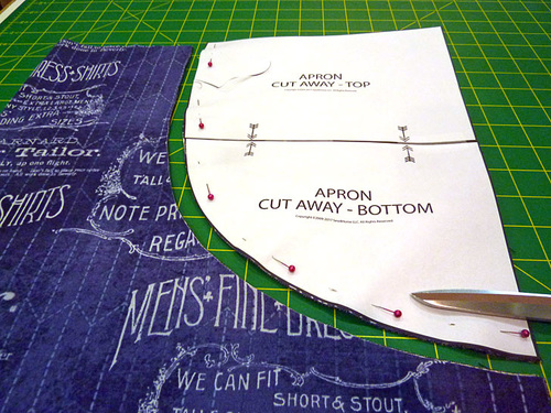 - Pin the assembled Apron Cut Away pattern in the upper right corner of the folded piece, aligning the top and side edge of the pattern with the top and side edges of the folded fabric (the corner with the raw edges, not the folded corner). Cut along the inner curved line through both layers.