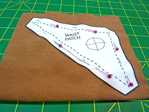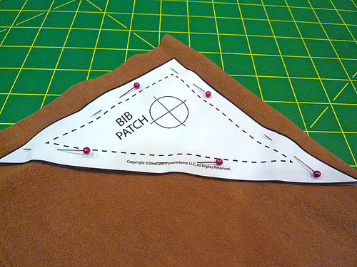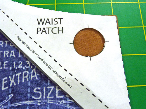 - Position the Bib Patch accents in the two upper corners and the Waist Patch accents at each outer corner of the waist. Pin in place, aligning the raw edges of the accent pieces with the raw edges of the fabric panel.