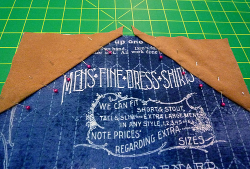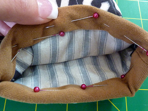- Place the front and back layers right sides together. Pin all the way around the sides and the curved end. The top straight edge remains open and raw.