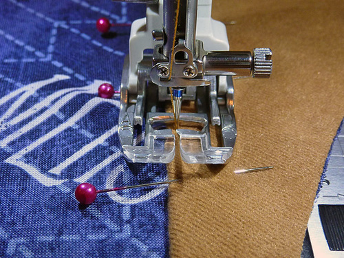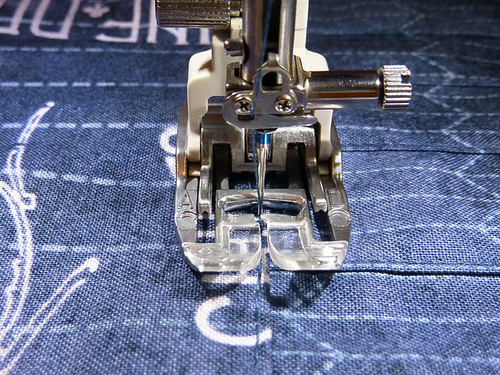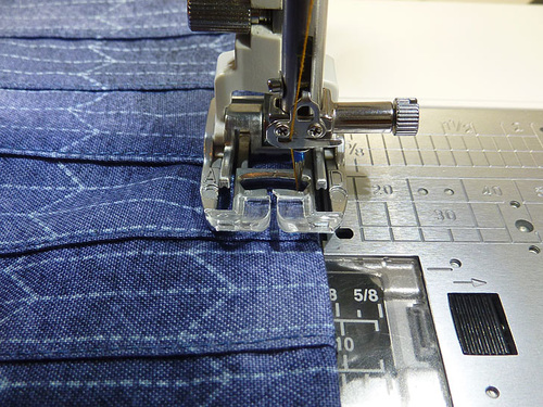- Attach a Walking/Even Fecd foot if possible or engage your machine’s built-in fabric feeding system.
