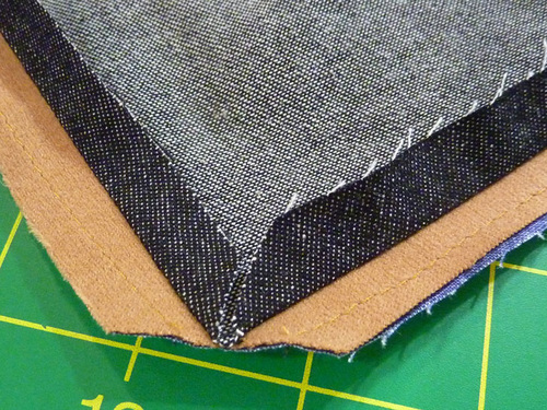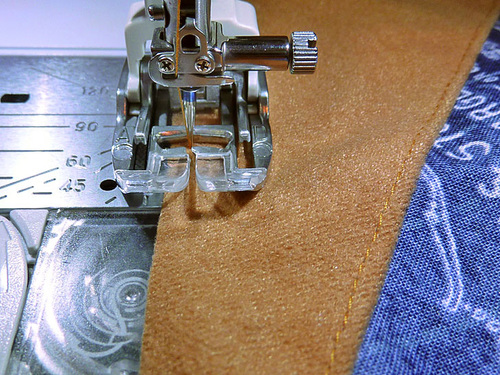 - Re-thread the machine with the thread you used to stitch the corner accents in place (we used a rusty tan to match our faux suede) in the top, and thread to best match the lining in the bobbin (we used black). Lengthen the stitch.