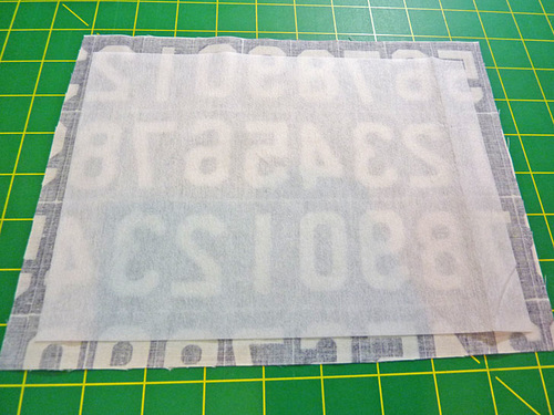 - Place an interfacing piece on the wrong side of each Numbers panel, centering it so there is ½” of fabric showing beyond the interfacing on all sides. Following manufacturer’s instructions, fuse in place.