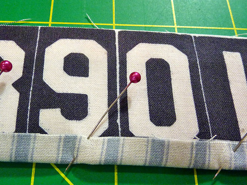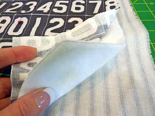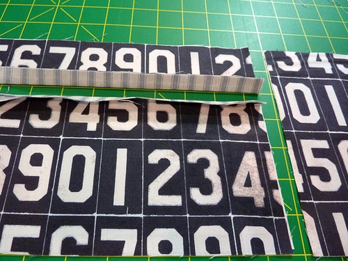 - Find the remaining fused Numbers panel and the remaining Ticking panel. Place these two pieces wrong sides together. This is the pocket back.