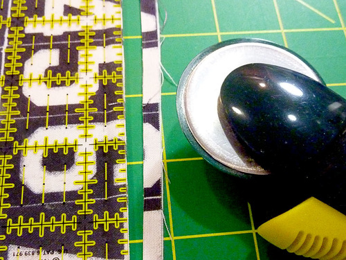 - Measure 2½” down from the top raw edge and slice the panel into two pieces.